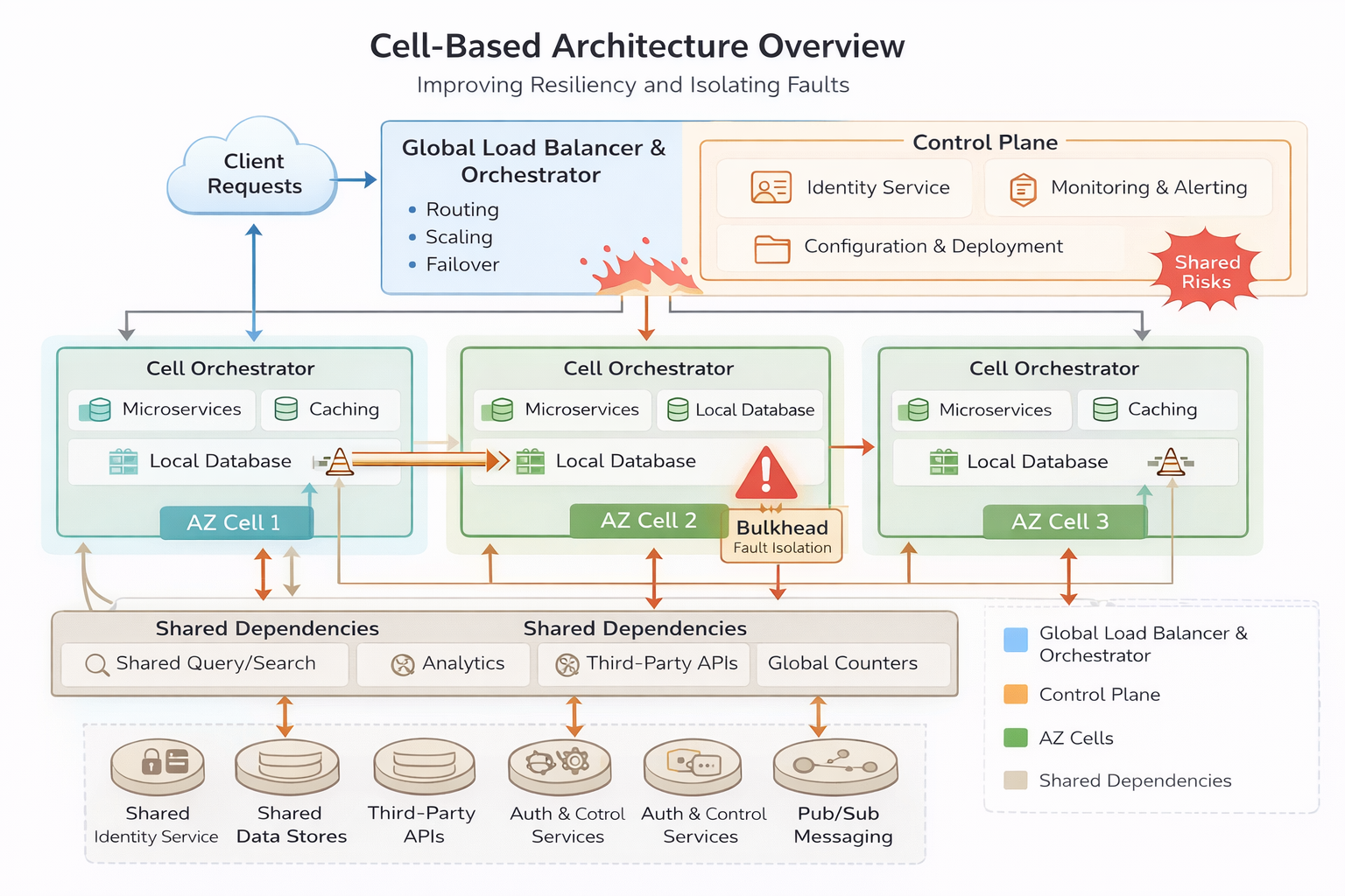 A cell is a bulkhead with a budget. You pick a boundary — an availability zone, a customer shard, a workload type — and rebuild your stack so that every dependency inside that boundary is independent of every other cell. Routing sits on top. When a cell burns, it burns alone. That's the whole pitch, and it is compelling when you've just watched a single bad config propagate across every region you own.