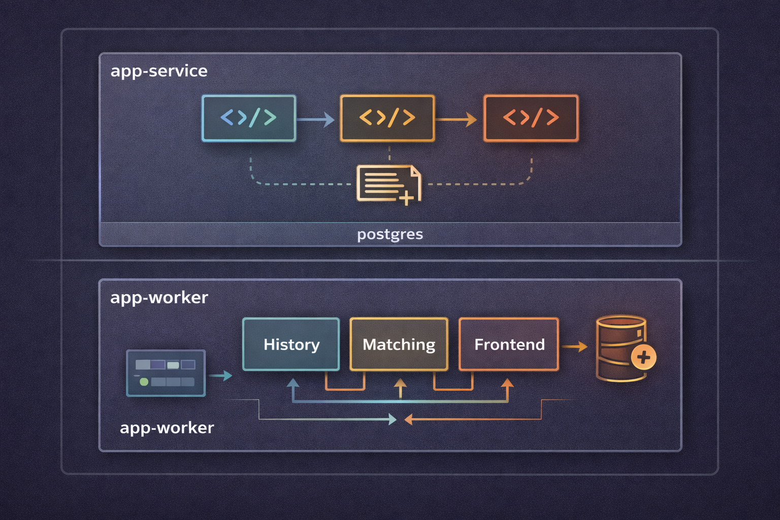 Temporal runs as a cluster. The Frontend service accepts RPCs, the History service persists event histories and fires timers, and the Matching service dispatches tasks to long-polling workers. Your application code becomes a worker that pulls tasks, executes them, and reports back. The workflow history — every input, decision, and result — is stored in Cassandra, MySQL, or Postgres behind the Temporal services, not in your application's database. That separation is the source of most of Temporal's benefits and most of its pain.