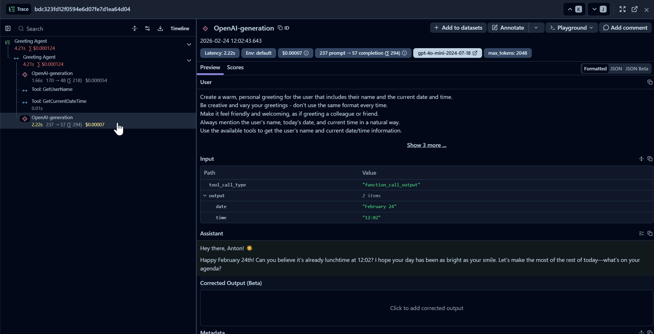 @Tracefor every tool interface from day one. The marginal cost is zero and the marginal value is enormous once something misbehaves. - Keep sensitive content off by default; gate it behind a feature flag for dev and targeted production debugging.